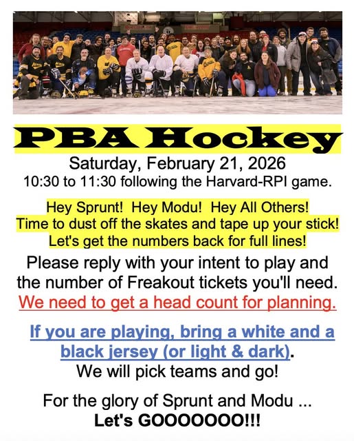 The annual Pledges, Brothers, and Alumni hockey game is coming up on February 14th, 2015! Come join us for the Corporation meeting, the Big Red Freakout hockey game versus Yale at 7pm, and PBA after the Freakout is over.